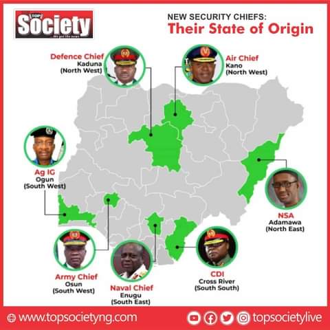 “Here is a breakdown of the state/region of service chiefs 1 Mallam Nuhu Ribadu, National Security Adviser (North-Adamawa), 2. Maj. Gen. C.G Musa Chief of Defence Staff (North-Southern Kaduna), 3. Maj.Gen. Taoreed Abiodun Lagbaja Chief of Army Staff (South West), 4. Rear Admiral Emmanuel Ikechukwu Ogalla Chief of Naval Staff (South East-Enugu), 5. AVM H.B Abubakar Chief of Air Staff (North), 6. DIG Kayode Egbetokun Acting Inspector-General of Police (South West), 7. Maj. Gen. EPA Undiandeye Chief of Defense Intelligence (South-South- Obudu Cross River State). For those accusing the Tinubu government of nepotism, the Chief of Naval Staff, Rear Admiral Emmanuel Ogalla, is from Igbo Eze North LGA of Enugu State. The Chief of Intelligence is from Cross River. Critics should try to dig for information before rushing to judgment”, he wrote.