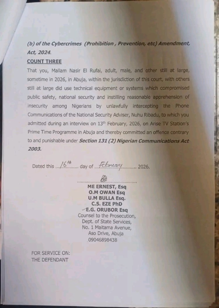 The Federal Government has filed a 3 Count charge of cybercrime against former Minister of the Federal Capital Territory and former Governor of Kaduna State, Nasir El Rufai. The charges against him stem from his comments in a television interview last week where he admitted to having access to the telephone conversation of the National Security adviser, Nuhu Ribadu.