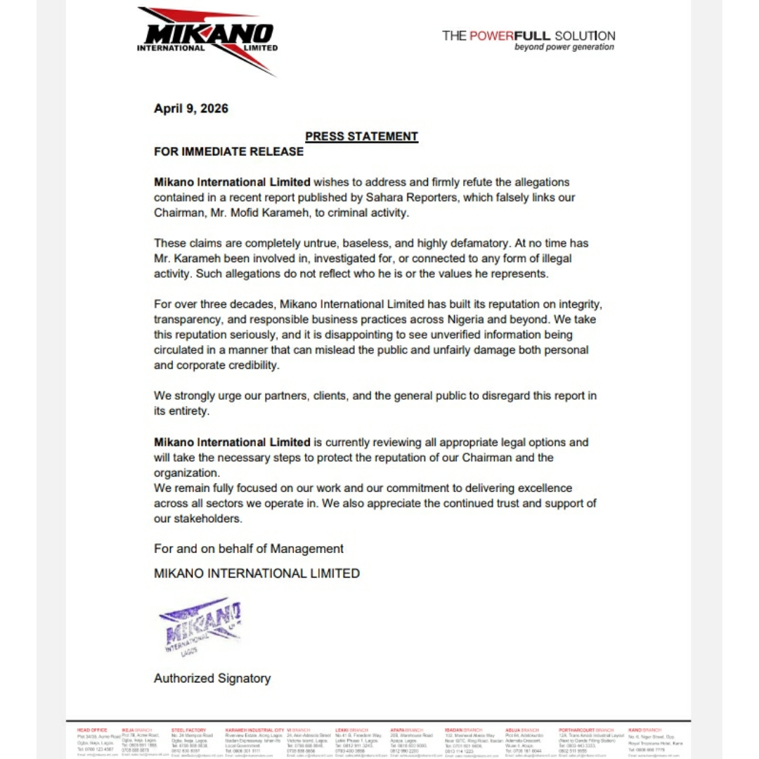 Contrary to the recent defarmatory criminal allegations published by Sahara Reporters against the Chairman of Mikano International Limited, Mr. Mofid Karameh.