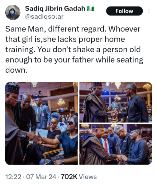 In the post, the user wrote: “Same Man, different regard. Whoever that girl is, she lacks proper home training. You don’t shake a person old enough to be your father while sitting down.”