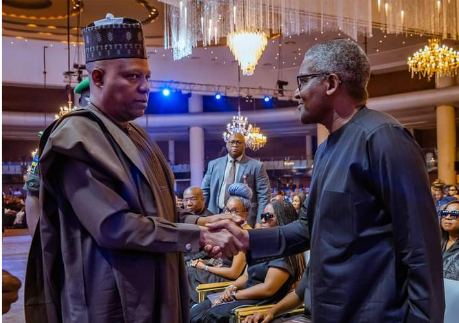 The post drew attention by contrasting photos of former Vice President Yemi Osinbajo and businessman Aliko Dangote, who were shown standing while shaking hands with Shettima at the same event.