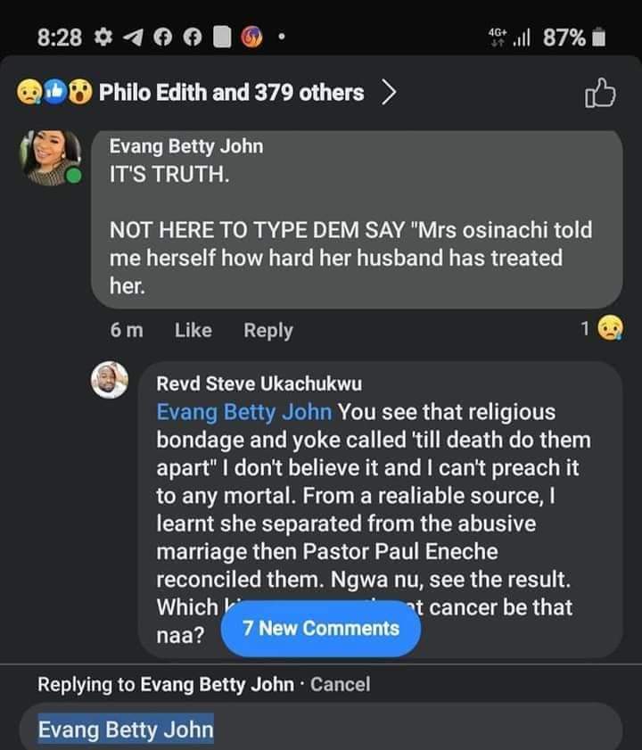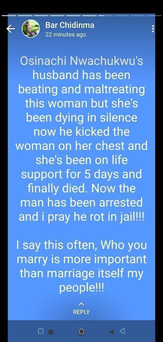 According to gospel singer Gold Martins, who shared screenshots of people who knew Osinachi confirming the domestic violence story, Osinachi personally confided in a mutual friend, explaining her experience and inability to leave.