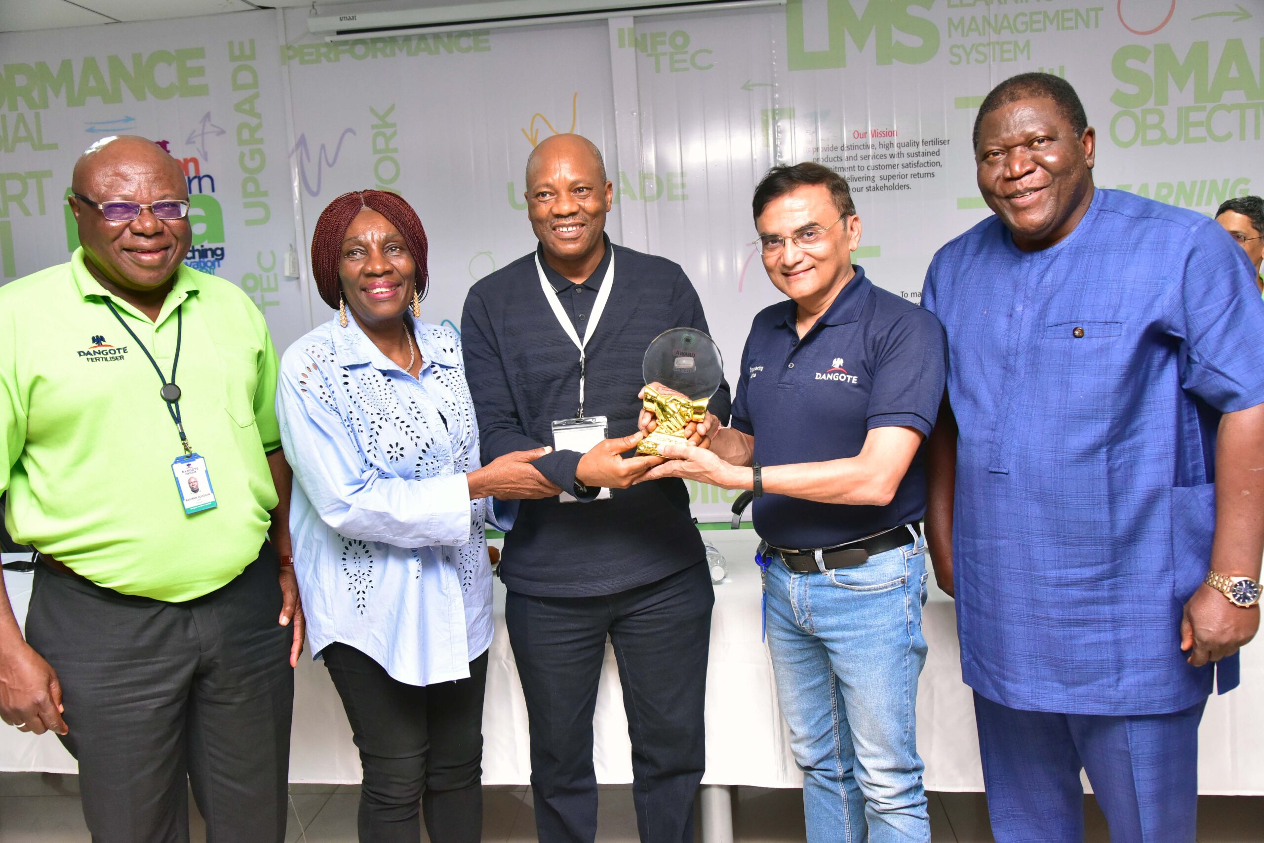 L–R, Vice – Chancellor of Lagos state University of Science and Technology Ikorodu, Prof. Olumuyiwa Odunsanya, Vice – Chancellor Lagos state University Ojo, Prof. Ibiyemi Olatunji – Bello, Managing Director/ CEO, Dangote Fertilizer, Vishawajit Sinha, Secretary of Committee of Vice – Chancellors of Nigeria, Prof. Yakubu Ochefu, During the Committee of Vice – Chancellors of Nigerian Universities, Visit Dangote Fertilizer Limited plant Lekki on Thursday 20th July 2023.